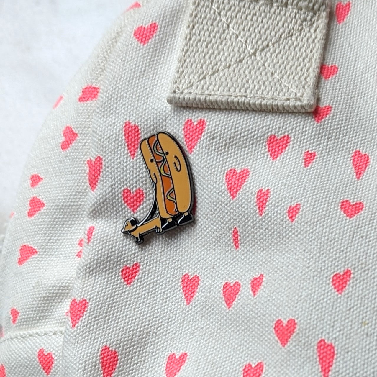 Put a funky s-pin on accessorizing with this Hotdog Walking a Weiner Dog enamel pin! This pin packs a punch of personality. It makes the perfect punny gift for a special someone or even better - yourself ;)